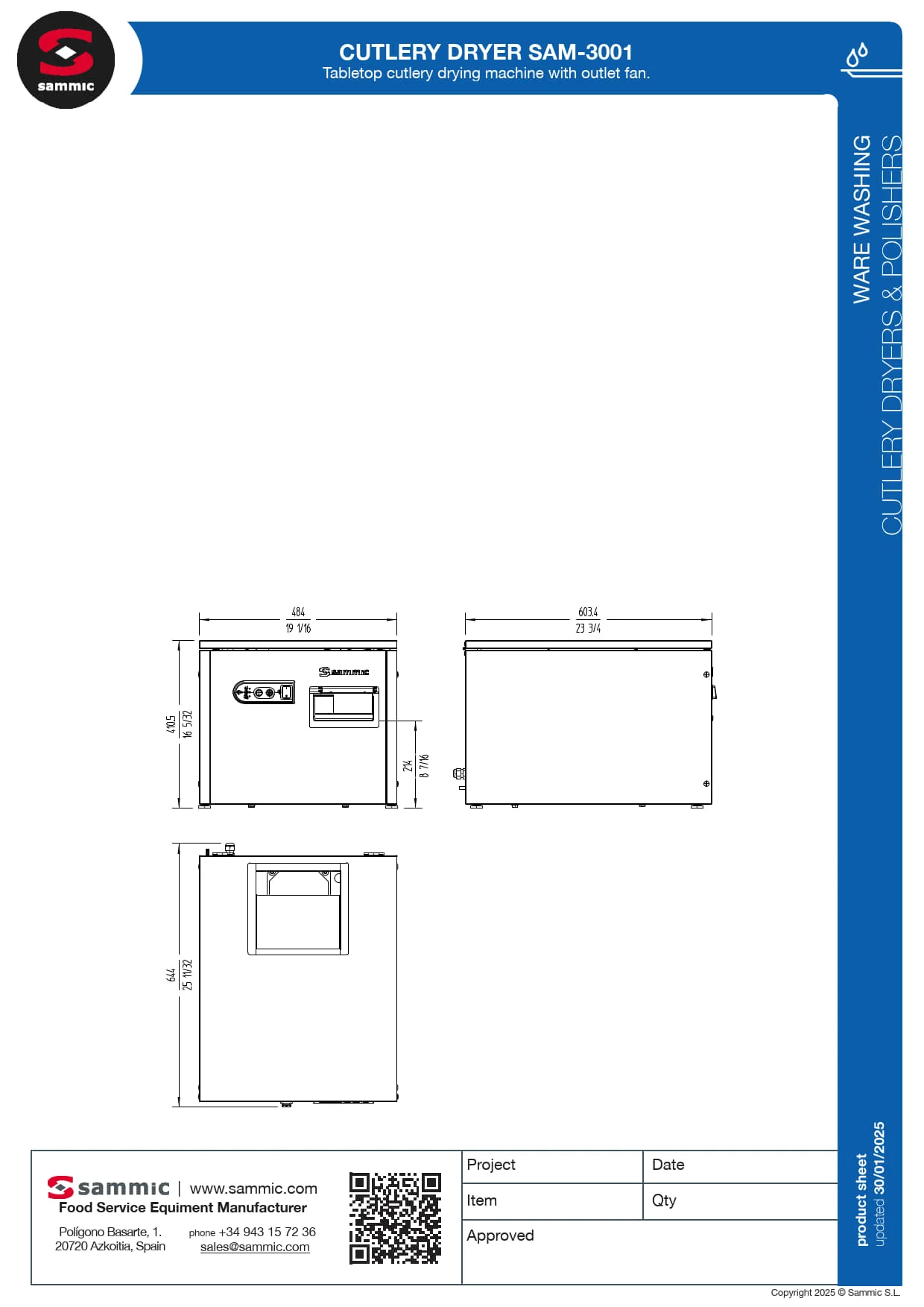 Other Dishwashers & Glasswashers. Features Tabletop cutlery drying machine with outlet fan, Output: 3000 pieces per hour, Fully automatic, Economic: saving on personnel cost and quick investment pay-back, Time-saving: hourly output of 3,000 pieces, Hygienic: UVC-ray germicide lamp sterilises both the cutlery and the drying product., Built-to-last, Stainless steel construction with stainless steel drying tank, Rounded stainless-steel coated cutlery carousel, Soft and fluid cutlery circulation, Intuitive control board: maximum information and control, Machine-ready luminous and audible signal, Luminous signal indicating if heating elements are activated or not, Luminous signal indicating that the polishing product must be replaced, Probe-controlled polishing product temperature: accuracy and quick reaction are guaranteed Luminous signal indicating probe breaking, Luminous signal indicating that the UVC-ray germicide lamp must be replaced, UVC-ray lamp can be disconnected for all essential cleaning or servicing, Polishing product drying cycle with automatic stop after using the machine: improved grain durability, Specsheet